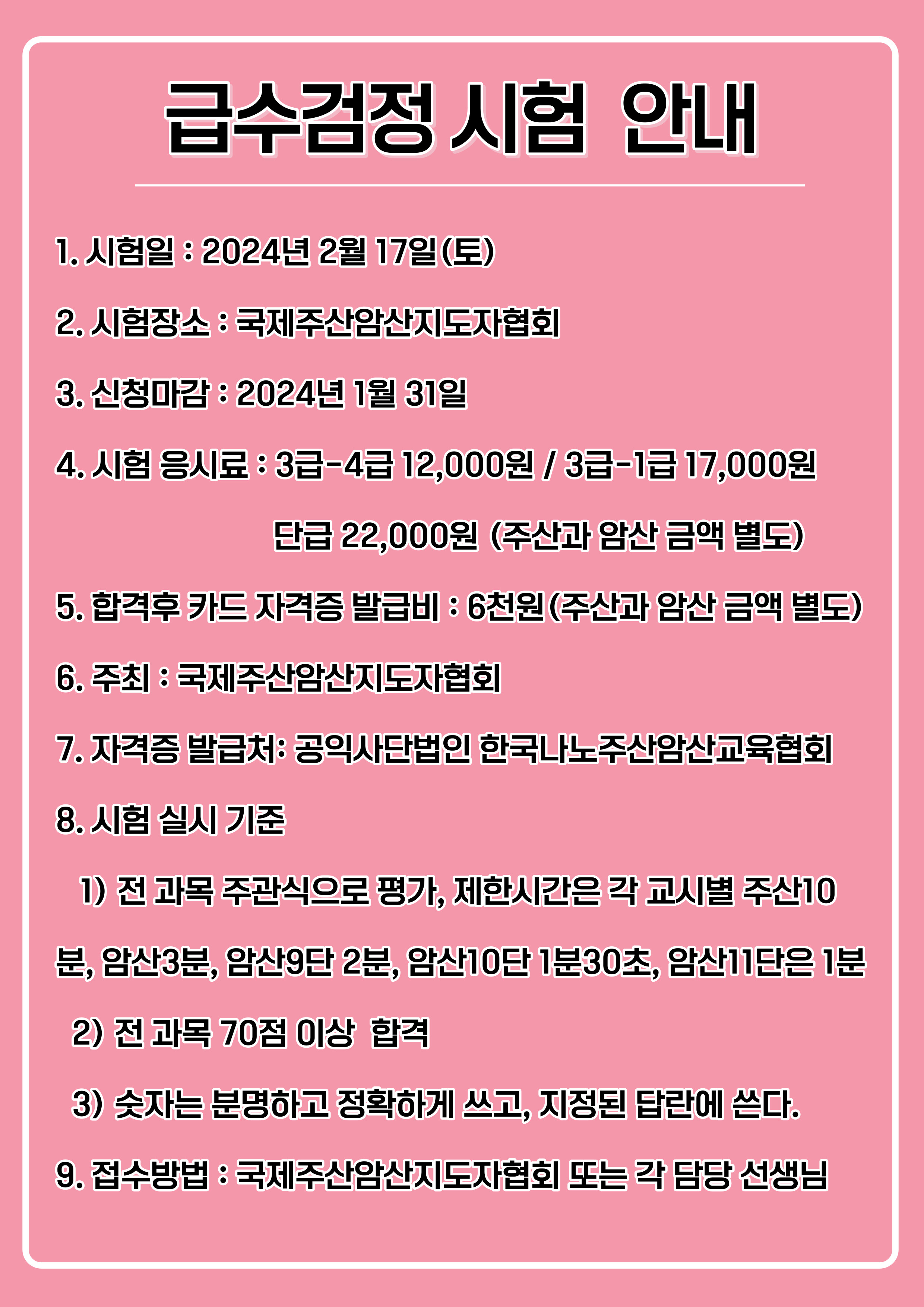 2024년 제 1차 주산암산 급수 검정 시험 안내